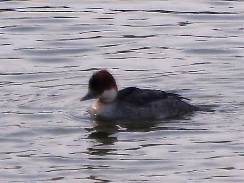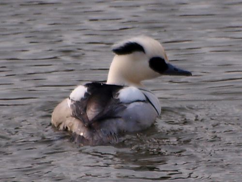 | ガンカモ目 ガンカモ科 大きさ:42cm。小型のアイサ。 特徴: オスは白い体で、眼の周囲、後頭、胸側に2本の線。 メスは頭部から後頸が茶褐色で、顔は白く身体は灰色。。 生態: 北海道の湖沼で少数が繁殖するが、大部分は冬鳥。 愛称、パンダガモ。 撮影: 2019.02.17 宮城県仙台市 鶴ヶ谷中央公園内 |