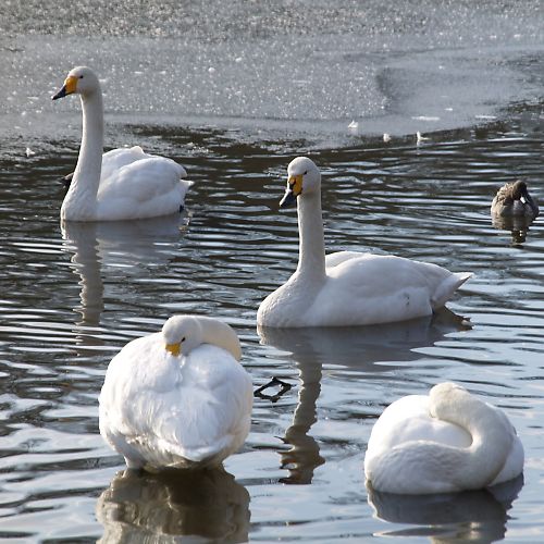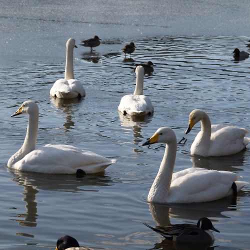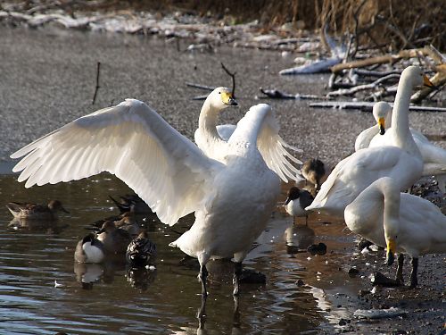 | この公園のひょうたん沼へ飛来するオオハクチョウたちです。 2008年の鳥インフルエンザの影響により全国的に餌付け自粛がどう影響 するか心配なところです。 尚、羽を痛めて留まっているオオハクチョウを年間を通して見ることができ ます。 |