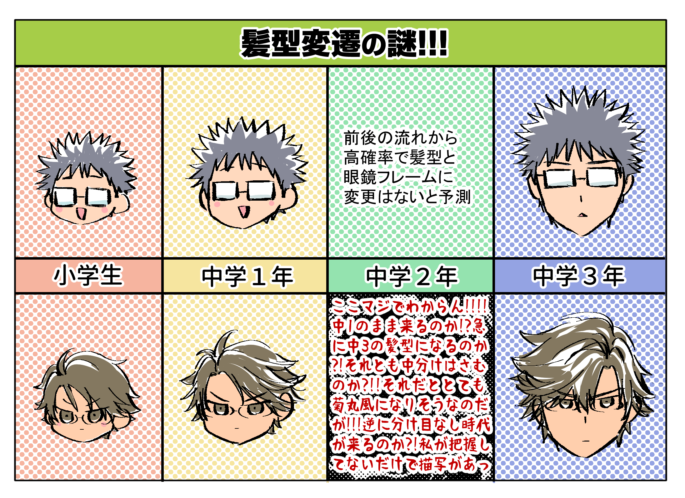 ずっと謎(そして色んなキャラが年齢変わるごとにちょこっとor大幅に髪型等変えてくる所を乾だけ(私が把握してないだけで略)絶対に変えてこない先生本当に乾が好きなんだからぁ…(*^◯^*)フフ)ちな(*^◯^*)の唱える説は「寝癖で中3分け目になった日に乾に似合うと言われて次の日から分け目変えた」説なんだ!(*^◯^*)