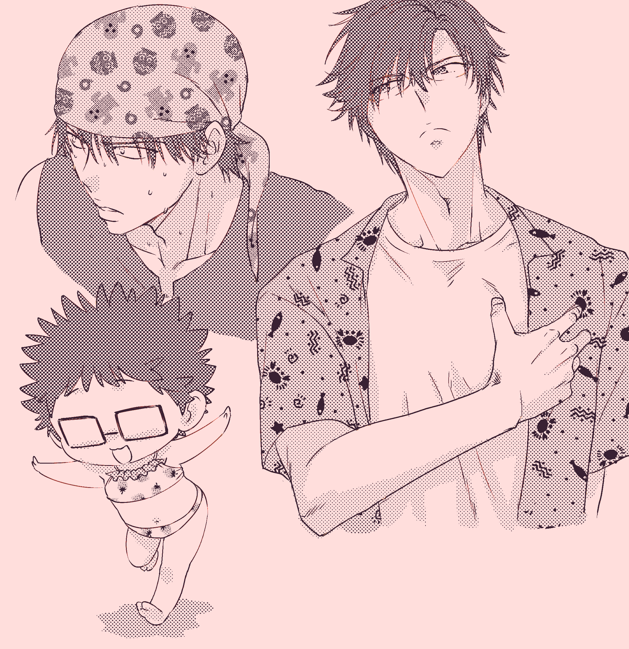懐かしのアイシースクリーントーン(無料)で遊んだ!!(*^○^*) 原作当時の同人とかで普通に使われてそう(偏見)(*^○^*) 乾の🍓柄は本当はぱんつで…と思ったけど自粛しておばあちゃん手作り水着👙という設定で描いたよ!(*^○^*)