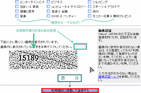 輸入如下圖所示。將下方畫像裡所看到的英文或數字填入綠框之中,千萬別填