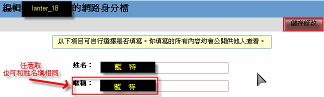 【暱稱】輸入你想取的中文名稱,要與上方姓名取一樣也行。其它資料