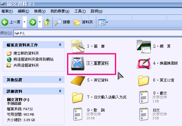 | 以下方硬碟裡的資料夾為例。欲將【3。重要資料】加密的方法。 |