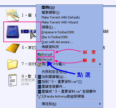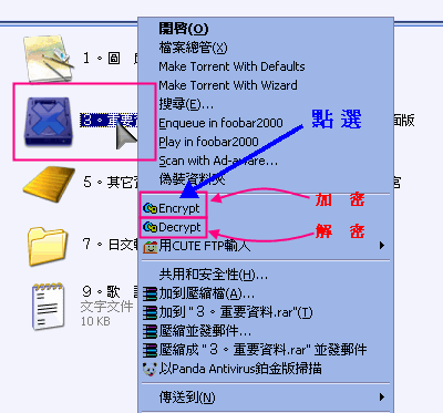 | 加密,你也可以選擇性的加密,就是選擇單一檔案加密即可。 |