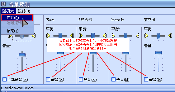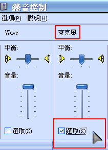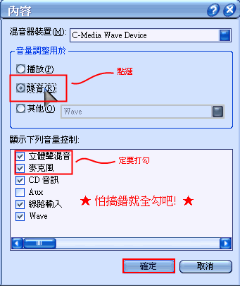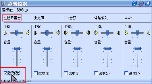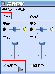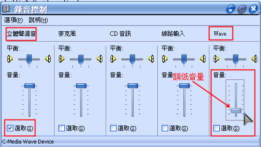 | ★注意:【立體聲混音】仍得打勾,而【Wave】只需調低音量,而不用打勾。 |