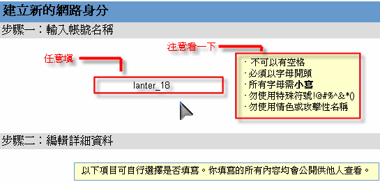 | 第四步:如圖所示,任意填入你要的帳號∼填好後,接下來下方有一堆資料要 |