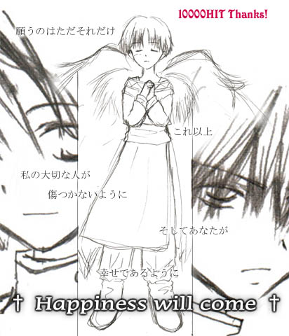 ということで、10000ヒット企画で無謀にもTOPに鎮座ましました望月画でした。 いつ書くとも知れない、天使系のパラレル話です。 コレがTOPにあったときは、各キャラの上をクリックすると、 それぞれ色をつけたイラストへ飛んで、なにやら絵の解説などあったのですが 面倒なので(滅)、やんないでみました。 もし希望とかあったら再UP…なんてね、いないッショ(笑)