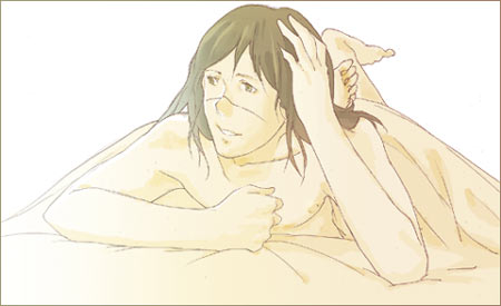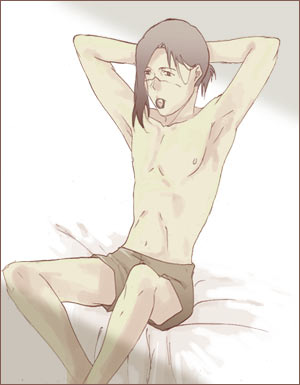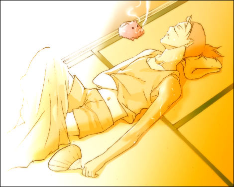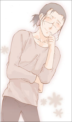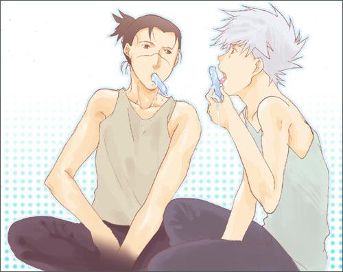 カカシ先生がむふふなイルカ先生ベストショット20選 カカシが思わずにんまりしてしまう、イルカ先生のベストショット、という企画です。 7月18日〜8月29日まで、絵日記で開催していました。(間に原稿期間をはさみ、少しお休みしていました) 絵と文章。 皆さんからリクエストですごく盛り上がり、自分のむふふな絵も描けたんで楽しかったです。 リクエストありがとうございましたv 1回目〜7回目 13回目〜20回目 20回目 8月29日 ●街の片隅で ![]() ・・・・・・・・・・・・・・・・・・・・・・・・・・・・・・・・・・・ 「――――――…♪」 どこからか、綺麗な旋律が流れている。 テレビだったか、ラジオだったか、つい最近、発売されたばかりの流行の曲だ。 なにをするでもなく、ぼんやりと歩道橋の階段に座りながら、誰の歌だっただろう、と思っていると、 「聞く?」 背後から、肩の真上に、ひょい、と大きな手が表れて、驚いた。 「…」 その手にはイヤフォンが握られていて、いま聞いたばかりの、流行の曲が流れ出ている。 振り返ると、どんぐりみたいな目をした、自分と同じくらいの背丈の男が、自分と同じように、歩道橋に座りながら、いたずらっぽい微笑みを浮かべていた。 いつの間に。 「…俺のことは気にしなくていいよ。こっちの耳で聞けるから」 受け取ったイヤフォンは、かすかに男の体温が移っていた。 「音楽好きなの?」 「人並みには。それよりも、人ごみでたった一人で聞いている、音しか聞こえない、あの空間が好き」 そっと耳たぶにはさんだイヤフォンから流れる旋律は心地いい。 「喉が渇いたから、俺、近くのカフェに行きたいんだけど、どうする?」 「…どうするって…」 「アンタがまだ、曲を聴きたいっていうんなら、ついてきて欲しい。このままのカッコで…、来る?」 男は、相手の了承を得ないまま立ち上がる。 その耳から伸びているコードがピンと張り、慌ててオレも立ち上がる。 「じゃ、行こうか」 「ねえ、これって、ナンパ?」 男相手になにを言ってるんだ。 口から滑り出した言葉に我ながら噴き出してしまいそうな気持ちでいたが、目の前の男は不思議そうに首をかしげただけで、くるりと向きをかえ、歩き出す。 その足取りは軽く、かろやかに、風に、ビルの谷間に、後ろ髪が舞っている。 オレは、耳をつないだコードが外れないように、その後を追いかけた。 ・・・・・・・・・・・・・・・・・・・・・・・・・・・・・・・・・・・ 今日のむふふイルカ先生は27日の0時に拍手をくださった方より、「ニット帽かぶって音楽を聴いてるイルカ先生」でしたv イルカ先生だって若者したっていいじゃないとのお言葉、たしかに!万年中忍服(?)を脱ぐか脱がされるかそれしかされてない(え?)イルカ先生もまだ20代…。たまには若者らしい格好を…!と思い男性ファッション雑誌なるものを見ていたんですが、全然参考にできませんでした…。(イルカに似合う服かぁ…) 洋服にお詳しい人に見られたらアイタタだと思いつつなんとか…!なんとか…!ていうか、この文章はカカイルなのかそうなのですか(そうなのですパラレルなのです多分…)夏休み、都会っ子な高校生のカカシと高校生のイルカ(学校が違う)という感じで…。 19回目 8月28日 ●棒ジュース ![]() ・・・・・・・・・・・・・・・・・・・・・・・・・・・・・・・・・・・ 「懐かしいですね〜そのアイス」 イルカが冷蔵庫からだしてきた棒ジュースを見てカカシが言った。 「昨日、ナルトたちが遊びにきて、余ったんですよ」 イルカの手の中で「ポキン」と割れて、半分がカカシの手に渡る。 「子供の頃、先生によく買ってもらいましたよ。 任務からの帰り道で、ジャンケンでなんの味にするかって、仲間同士で喧嘩して、先生に怒られて」 「あはは。本当、昔からありますよね、このアイス」 イルカが棒ジュースをぱくっと咥えて嬉しそうに目を細める。 その口元に見とれていると、不信な目が帰ってきた。 「…なんですか?」 「いや、棒ジュースって、ラスト、全体的に溶けてくるじゃないですか。 それをイルカ先生がチュ―チュ―吸い出すまで、待ってようと思って。あんな風に―――」 「…溶けてますよ」 「え…あ、うわっ!と」 いつのまにか肘まで流れ溶けたジュースをべろり、と舐めていると、イルカはくるっと後ろを向いてしまった。 「イルカ先生、機嫌直してくださいよ〜」 「嫌です」 氷のようなイルカの声に冷や汗を掻き、両手を溶けたアイスでべとべとにしながら、このアイスにはいい思い出がないなあ、と一人ごちるカカシだった。 ・・・・・・・・・・・・・・・・・・・・・・・・・・・・・・ 今日のムフフイルカ先生は沙羅さんより「棒ジュースを食べるイルカ先生(カカシ付き)」でした…v 棒ジュースと聞けばお約束、このネタしか思い浮かびませんでしたよ!(変態)カカシ、くるっと後ろを向いたイルカの機嫌を損ねたことより、イルカが背後を向いたことで、ラスト