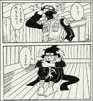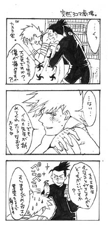 違うだろ! しかし、里を誇る上忍にどいてくれとはいいだせない悲しい中忍だった…(哀) 子供が起きているうちはまだいいです。 ナルトが寝てから本当の恐怖は訪れるという…哀れな。 この日記では珍しい、ちょっと弱気なイルカてんてー 日記が翌日になってしまいましたね。 私も子供のころは川の字になって寝たりしてました。親子で。 寝相悪かったので朝になると布団から二メートルくらい離れたところでザコ寝していたことが多々ありました。一体どうやって移動したんだか。大人になったら直りましたけど。夢遊病ではないと思うのですが…あれは子供特有の病気ですよね。他にも子供って変な癖があったりしますよね。なぜか大人になると完治する。 子供って不思議だ。 …ところで、ベッドだったら確実に落ちて頭ぶつけてますね。 明日はお休みです。 世間では三連休とかいってますが私のところは一日だけです。あ〜(泣) いいかげん年賀状の返事かかなきゃ… 今日はカカイルかけるぞ〜!!うはうは(嬉) 1月7日 イルカ先生は今日も怒らねばならない。 ![]() …某上忍も相変わらず尻にひかれています。 一度でいいからイルカてんてーに怒られてみたい。 がみがみいわれながらイルカ先生の声ににやけてしまいさらに怒られて拳骨くらうくらいがいい(←マゾかい) 『愛というよりずっと真面目な』 ↑裏的絵ですのでご注意 カカイル、書き溜めたネタから少しづつ切り崩しています。 ネタは仕事中に考えたり、メモしていたりします。 仕事始めでした。6日からです。非常に忙しいです。てんてこまいです。 午後から私、急に具合が悪くなったと思ったら工場長も倒れそうになってるの。 いつものセクハラにも元気がない…。 昨日の日記痛いですね…もう痛すぎる…。というわけで消します。 恥ずかしいのでこれ読んだ人、忘れてやってください。 今更なんですが、カカシ外伝終了しましたね。 そっか、リンちゃんはカカシのことが好きだったんだね…カカシそっけないね。切ないね。 オビトはすごく可哀想でした。 あと…イルカ先生一度でもでてきてくれたら嬉しかったのに。 ハリポタ映画ついにみました。 感想は、また後日。 1月5日 お手合わせ願います!(byイルカ) ![]() なまった中忍の体を鍛えるためにカカシに特訓してもらうイルカてんてー。 中忍試験やった森あたりで二人っきりで…。 別の修行もしてくれそうだ!やったね!(なにが) すいません。頭の悪い加工をしてみました。 カカイルっぽくなくてすいません。 もう3時回っていますね。いつも寝るのは普通にこれくらいです。睡眠時間4時間3時間がザラ。会社があるときも。 だ っ て カ カ イ ル か け な い も の !(雄たけび) 今はねーうふふ今は面白い盛りなんでじゃんじゃん描きたい時期なんです(日本語おかしい) というかこのジャンルってカウンタ周りはやいっすね…以前のジャンルじゃ考えられなかったのでまじでびびってます。というかカウンターが悪いんだろーな…リロード機能が。 キリリクとかやってみたいです。もちろんカカイルで! 777なんてどうでしょうか。 踏んだ人でもしよろしければ申請してくださいませんでしょうか。 掲示板で聞きますゆえ。 オンリーカカイルリングと中忍手配書に登録してきました。 foleってなんだ…(汗)holeですね。教えてくれたのはオンリーカカイルリングの管理人さんなんですがすごく助かりました。 1月2日 あいたたた ![]() なものを描いてしまいました(恥) いや。コミックで初めてみた当時、喪服ってすごくセクシーだったんで非常に衝撃的だったんです。 イルカてんてーの、さ、鎖骨初めてみましたよ(激萌)話題が古いっすね…いやただ単に描きたかっただけです。 最近はコンビニのチョコレートにはまってます。太るなーと思いつつ止められない。(というかもう太ってます。腹が)ガーナチョコレートのクリスプスティックが一番好みです。仕事の昼食の時これ食べてたら「子供っぽいね」って工場長に言われてしまった…がーん… 1月1日 アングリー! ![]() 背面投げをかまされたかかしせんせー。 すっごいポーズだ… HPの方、もっと色々改造したいです。 こう…和風に、イラストレーターなんかつかってデザインチック(←持っているには持っているのですが)にしたいんですがいかんせん和風実は苦手で(洋風塗りだし)和風塗りってどんなんだ。 四年ぶり(もっと短い?)にカカイルリンクを回ってました。好きだったサイト様がもうなくなっていたり(これが一番ショックだった…)活動停止・休止になっていたりと辛いことがあったんですが、素敵なサイト様もたくさんできていて楽しんできました。100のお題ですごく面白い小説をお描きになるサイト様があってめちゃ興奮しました(笑)あ〜はまりたてって、どんなジャンルでもそうですが、新鮮でいいですね。ハリポタの時もすごかったもんなあ。 12月30日 いたたたた!ちょ…イルカ先生痛い! こらっ!カカシ先生!人の話は最後まで聞いてくださいっ! ![]() な