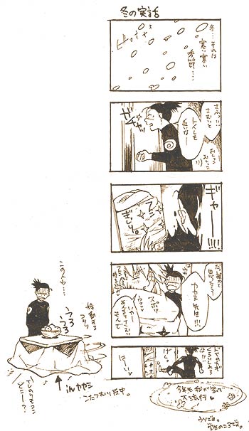●どこまでもカカイルな徒然日記● 3月3日 ![]() 最近、パソコンの動作がおかしいです…かなり。 再セットアップだけは勘弁してほしい(涙) 昨日の日記…かなり錯乱しているみたいで(改定)… 一度UPしたものをひっこめるっていうのはプライドが高いっていうんじゃないの? って妹にお叱りの言葉を食らいました。あいたた…あいたた…そうなんじゃろうか…(相当自己嫌悪)反省します(><) ↓更新なんもないのもアレなんで…(吐血) ![]() 気まぐれにバナー更新…これは…またすぐ変えると思います。(本当はイルカだけっていうのがいいのですよ…) ![]() イルカ先生…うふふ…可愛いな(ほも臭すぎのよーな…) 最近はイルカラブっていう(のもありますが)という感じからカカイルラブ!って感じに移行しています。 じ、児童文学なんとかしたいデス… 3月2日 ![]() 結構最近描いた自分設定のラクガキ。どのへんがカカイルなんだか… 3月1日 どういう状況? ![]() …社交ダンス? 酒宴の出し物でワルツを踊らされることを強要される某中忍のために 某上忍が手伝ってあげたり。 カカシは数回本を読んだだけで完璧振り付けとかマスターしてしまいそう。 「イルカ先生、ハイ!、いちにー、さん、いちにー、さんですよ!」ってカカシが言って手取り足取り… イルカは「オレ踊りなんて盆踊りしか踊ったことないですよ!」とか言って。 ワルツ(のつもり!)。振り付け超出鱈目。なんだか変な絵だ… …児童文学ものあとリングつなげるためにはまとも絵があと四点は欲しいよなあ…(遠い目) 2月28日 ![]() 昨日の絵…まずかったでしょうか?(不安) 今日は〆日。忙しいながらもカカイル妄想で頑張っていました。仕事。 漫画…こんなアホいものをUPですいません。完璧ギャグです。 こたつむりなカカシ。そしてふとん虫なカカシ。 こたつむりは日本のどこまで生息しているのでしょうか。知りたいです。 (沖縄とかはいないだろうな) えー…。こたつもふとんも経験済みです。学生のころは家族ぐるみでやってました。 さすがにこたつが台所に移動するようになってから母親に怒られて二度としませんでしたよ。だって寒いんだもん…(もんとかいうなー…) 本当に、寒い冬はとても寒いです。この地方は。(東海ですが) 明日はもっとまともな絵にしましょう。 2月27日 ![]() リンクページ追加。ボーイズ系とオリジナルイラスト、小説サイト様… カカイルじゃないんですが、オリジナルボーイズにも最近手を出してきました。(描いているわけではなく読み専ですが)少年より青年。おじ様より青年。今は青年が熱いです。 遍歴: 小学生のころは幽遊白書、パプワ(シンタローファン)で10代、20代。 中学生のころは40〜歳くらいのおじさまに萌えていました。 このころは新選組と京極堂大フィーバー(仲間内でも)。あとガンダムWも 大学生になるとハリポタで30〜のおじ様たち…で、 今はカカイルで20〜…なんか若くなってきているよ(汗)。 少年系も好きです。節操ない系です。 リンク、あの方は今あのジャンルで活動なさっているのね〜と萌え萌えしています。イベントなかなかいけないのでネット通販だけが頼り。いきたいな…イベント… どこもこっそり大好きサイト様です。 今回の絵…いつもと違うようですが、椎名林檎を聞きながら描くとこうなります。 曲によってかなり左右されますよ。 そろそろこのページも限界… 2月26日 ![]() お遊びなカカイル。ふわふわ。リリカル路線まっしぐら。 もう26日ですか…?早い…今日は一日ネットサーフィン&素材探し…。 コンテンツ更新(他ジャンル)。 ハリポタ大人絵ラクガキUP。シリルでスネル。+ピルグリムイエーガーにアデールUP。描きだすと止まらない。 明日は絵と共に小説もUPする予定でございます。 西へ東へ奔走中でございます。 2月25日 ![]() こんどこそ本当に会社でのラクガキ。 会社従業員みんな外で作業で、事務所が暇になるからみつからないからってこんなものばかり描いてますよ。でも仕事忙しいときはすっごく忙しくなります。……信じてもらえないかもしれませんが… 本当裸ばっかり毎日はだかまつり状態でどっかのお祭りでもないんだから、反省しなければ… オリジナルイラストサイト作ることにしましたよ。 しばらくは新サイトのために西へ東へ奔走することになりそお… もちろんカカイルも続けますよ。 ![]() ハウル資料集3000円もするの買って、マンガ本一万円分も買ってしまった… 誰も怒らないからって買いたい放題。…社会人って素晴らしい。 2月24日