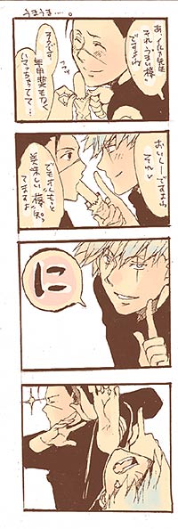![]() 呟き日記 ●カカイルだったり別のコトだったり…独り言● 4月5日 ●寒くおめでとう自分! ![]() 10000ヒットありがとうございます。 一万いったら〜と以前いいましたが、描きました。 カカイル+ゲンハヤ。 誰からもなんのアレもなくても一人で祝います! 寒く、痛く、ホモで、ホモで!!(←頭おかしい人みたいだ) これもひとえにサイトに遊びにきてくださる方々のお陰です。 つまらないネタをUPした時も遊びにきてください。 露骨に減るカウンターに一喜一憂しています。(爆) しかし、このジャンルに来てから驚異的に更新はやくなりました。 そしてカウンターまわりも過去最高だったり。 以前は万いくのに一年、もしくは半年はかかっていましたから、この速さはすごい…と、思います。 前ジャンルから飛んできてくださる方のために、スネルの絵もUPしようと思ったのですが、 今ハリポタをやるとホモになってしまう確率が99、9999999999…パーセントなんで困っています。どうしよ。 携帯をようやく買い換えました。 あの人、ずっと連絡くれていたんですね。 「心配してたよ」って、ありがとうございます。 …じーんとしてしまいました。 日曜日に会う約束をしました。 私みたいな男女にこれほどよくしてくれる人なんて、もういないかも。 嫌われないようにしないと… 最近は会社ではやっている男同士の尻を触りあうセクハラを、ウフフフvv(邪悪)、と微笑ましく見ています。 そして相変わらず工場長からのセクハラ三昧です。尻をおいかけて尻を触られる。変な職場。 闘の書、イルカ先生、丸ッ!お人よし、という言葉ににやにや。そこをカカシ先生につけこまれるのですね(腐女子) あと、いろんなところで言われていまうようで便乗なんですが、歳おかしいです。私と同い年でちょっとキュンvとしてしまいました。カカシの方はまともに27歳だったから4歳も違う。歳の差カップルとはいいきれない違いですが、なんかドキドキ度があがります。誰か訂正しないかな…? 人気投票総合一位ははたけカカシ。二位がナルト。四位のイルカ先生の台詞「残念だったな、ナルト」は聞き様によってはカカイル。 しかし、なんも戦っていないイルカ先生が四位とは、他のまともにバトルしているキャラが哀れなような…(カカイラーとしては満足なんでよしとするですが!) 4月4日 ●色々スイマセン… ![]() こんなんばっかりですいません…。 このアングルかなりえらそうですよ(震)すいませんすいません。 …イルカてんてにつっこませようと思ったんだけどつっこみどころが見つからなかったので、カカシには一人寂しく主張してもらいました。 …カカシのサイズはどれほどのもんだろうとか。 誰か一緒に考えてみませんか。気になりませんか?(←アホ) ちなみに世界で一番デカイサイズは仏人だそう。 サイズを聞いて驚きました。そんなの普通に●●●の?という感じです。 あと世界で一番デカ●●●の国も同じ国だとか。いや〜…世界ってすごい。 こんな話題ばっかりか… 漫画遅れててすいません。 楽しみにしててくださる方がいらっしゃるようなので…忘れてはいませんので! ジャンプ読みましたよ。 敵忍者早くビジュアルみたいな〜!! イルカ先生の出番は期待してません。この状況ででてくるほうがおかしい。 ナルト単行本買いましたよ。 カカシ外伝、本誌で全部読みましたけれど、いいですね…むふふふv(不気味) 過去話って乙女心をくすぐられます。 微妙なノリのサイトですいません。 4月3日 ●触れるところからあなたを知る ![]() ただいま――――そう言って、ドアが閉まると同時に、触れるだけのくちづけを。 かさかさと乾燥したオレの唇にくらべて、あなたの唇はしっとりとしていて、その割りに冷たい。 もうあいさつのようになってしまったそれだけど、 そんなところから、あなたの今を知る。 任務先は遠い雪国でしたか? それとも、白霧立ち込める山海の中でしたか? あなたの体温はいつもと変わりありません。 嗚呼… ご無事でなにより。 ――――おかえりなさい、カカシさん。 …良かった。 4月2日 ●すれ違う恋心、ささやかな日常の変化 ![]() 家に帰る。 今日も一日疲れた。 ごくろうさま俺。 誰もいないがらんとした部屋にあがって、居間に荷物を置く。 どさりと音がする。 居間には、シロウサギの格好をしたカカシ先生がちょこんと小さくなって正座をしていた。 俺はその横を通り過ぎ、台所にたつ。 疲れがたまっている。 蛇口を捻ってコップに水をつぐ。 シンクの前でぐいっとそれを一回、呷った。 水は透明に澄んでいて、心地よく、喉をつるりと滑った。 居間に戻る。 シロウサギ姿のカカシ先生の横を通り抜け、ちゃぶ台の前に正座をする。 そして、もう一杯、水を呷る。 「ふー…」 落ち着いてきた。 さてと… 俺の目の前(正しくは後ろの壁ぎわ)には、認めたくない現実がある。 認めたくなくても認めなければならない。それが現実だからだ。 ぶわと吹き出す汗。震える声が喉からほとば