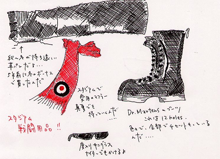 スタジアムに行くときは、タダの格好じゃない。レッズのレプリカなんて生ぬるいものは、着ないのね。笑