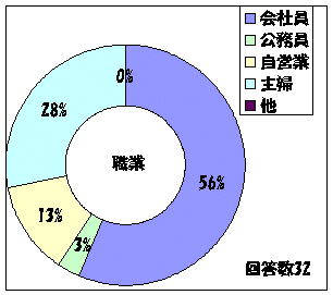 今回の参加者は幹事団・先生方も含め、トータルで46人となりました。多数お集まりくださり、本当にありがとうございました。 その中から、アンケート回答にご協力いただいた方々の性別と職業は左図の通り。 女性が6割。職業では約6割の方が会社員。4割の方が主婦(主夫という方はおられませんでした)。ということで、女性の方でもまだお勤めされている方も多いわけですね。自営や公務員の方々もおられました。 |