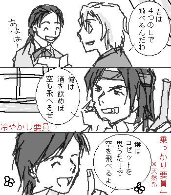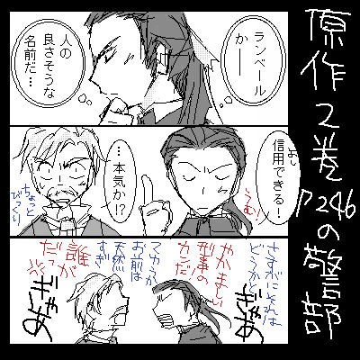 ![]() その2。1コマ目→レーグルとバオレル、2コマ目→クルフェ、3コマ目→アンジョとコンブ |