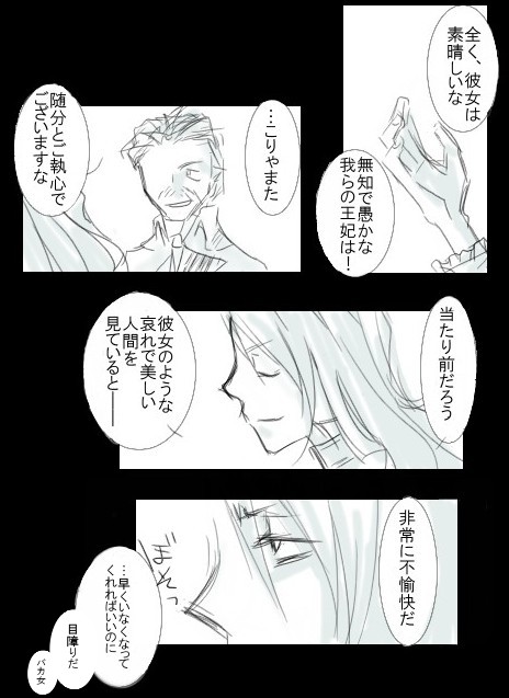 えらい貴族の人にありがちな、ドロドロっとした幼稚なキモさがあったらいいなあ!と思ったのですが、何だかわけ分からなくなりました。見切り発車は大の得意です。 おかしいな、タカシマにーやんのゴツゴツしたオルレアン公が好きだったのに、何でこんなにナヨナヨしてるんだろう。しかも、あっち系のホンモノっぽいよ。 ともかく、オルレアン公はマリーに複雑な感情を持ってるといいなあ。そんで、イライラムカムカと鬱屈がたまって、『めんどくさいから消えてほしい』ってな感じで。何か、思春期の女子学生みたいですね。それもまたキモくていいかもしれません。(2007.1.6) |
