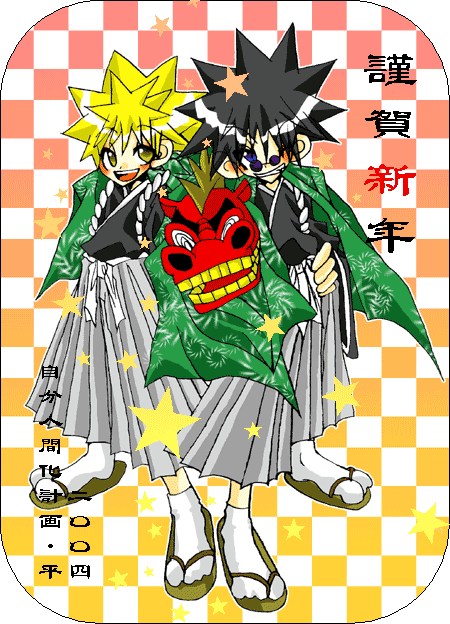 ものすごーくラッキーな経緯でGET! (一月中にいただいたのに・・作業が遅くなりまして、失礼致しました〜。。。) あまりにも嬉しくて、己の果報者さ&シアワセさを独り占め〜♪ なーんて 思っちゃいましたが、それではやっぱり勿体ないのでサイトUP致しまーすv 拝見した瞬間から『カワイー』及び『カッコイー』をひたすら繰り返し、 一時間近くもただただ見惚れていた 無敵のイラストですよーvv 純然たるお正月仕様、しかもカワユイちびキャラなのに どこかしら艶っぽくて素敵なのですvv そして気になる獅子舞(笑) 胴幕に隠れて・・・なんかしちゃったりして。うふvv (←スイマセ・・・) ひらめさん、お年賀イラスト本当にホントにありがとうございます! |