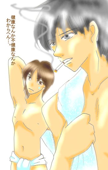 《コメント》 学生アリスと江神さんのあんな姿を見たんだったら、 作家&助教授のこんな姿も見てみたい!というご無体 リクエストで御座います。色は相談の上白としました。 作家アリスの褌姿もいいもんですなぁ。結構良い体してて…。 助教授はわざと自分でフレームから外れる様にしたん でしょうかね?あの人ならやりかねん。煙草も手放さんし。